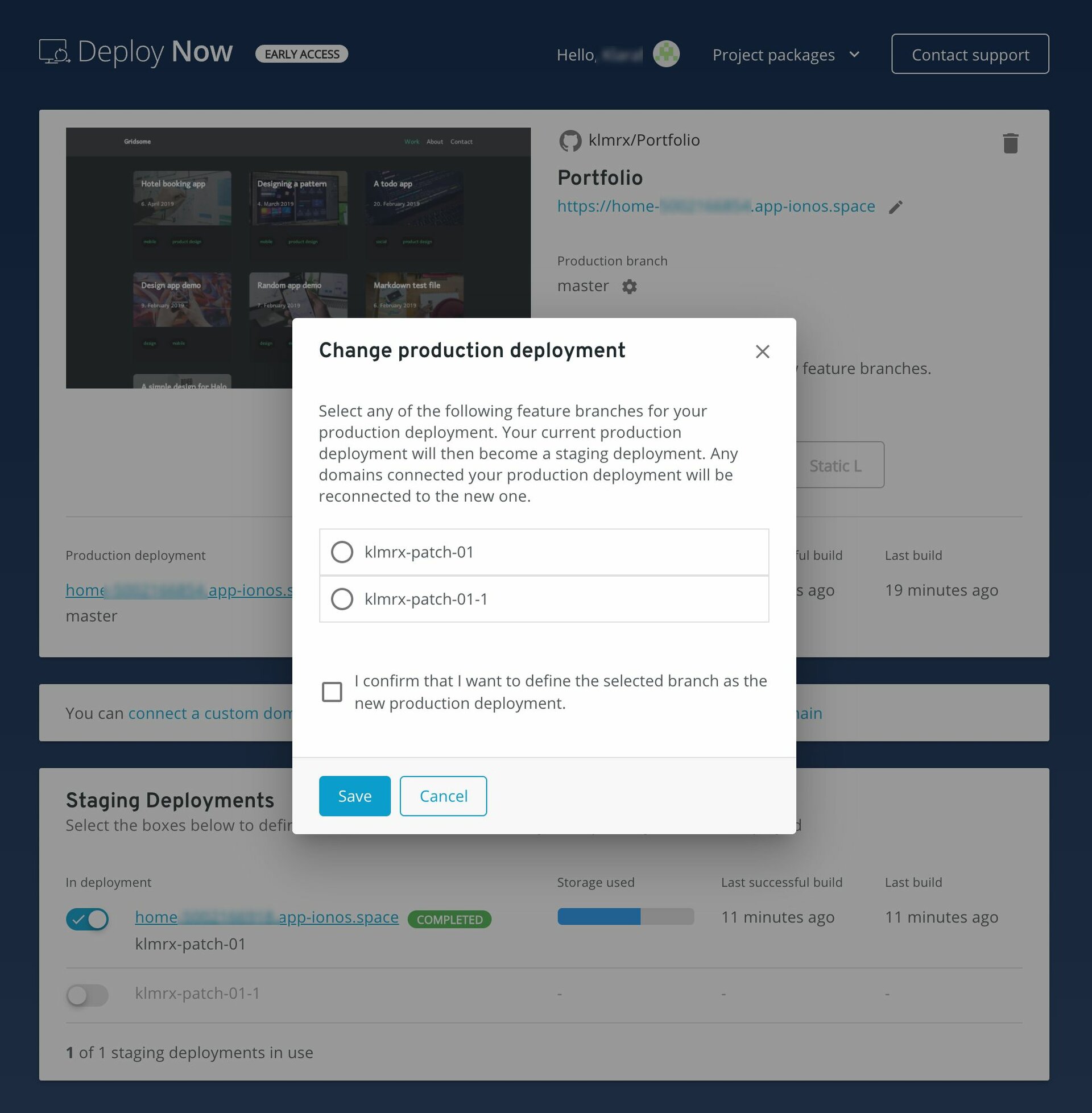 Inoltre, hai la possibilità di creare staging deployment con le features branch del tuo repository GitHub. Gli staging deployment veranno dotati automaticamente di un URL di anteprima. Per creare uno staging deployment da una feature branch, ti basta selezionare una delle feature branch elencate su "Staging Deployment" e salvare le modifiche.