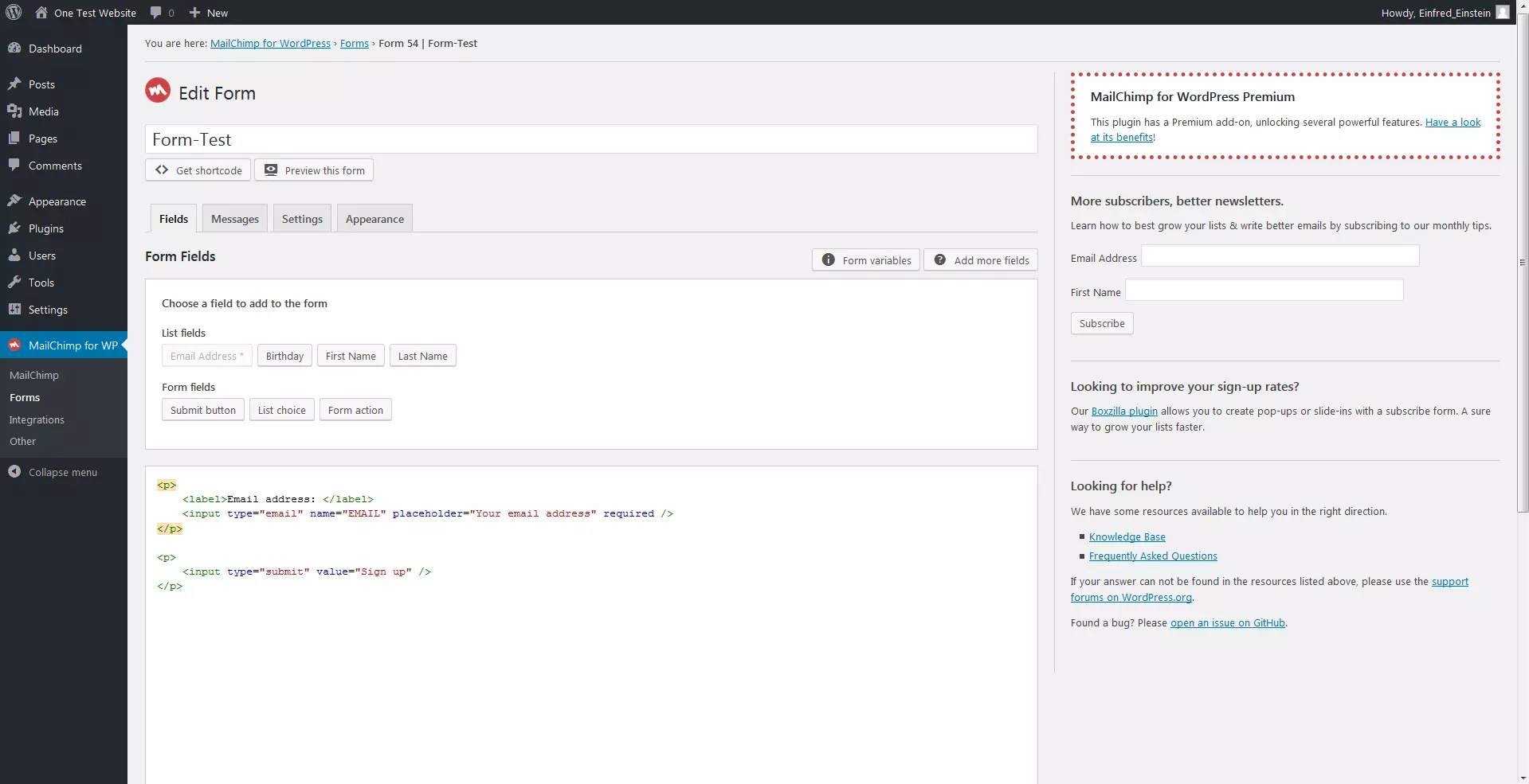 Nella visualizzazione del plug-in avete a disposizione diversi campi relativi alle liste e al modulo per impostare un modulo di registrazione personalizzato per i vostri utenti. Nella versione iniziale avete la possibilità di richiedere indirizzo e-mail, nome e cognome e data di nascita. Al vostro modulo potete anche aggiungere tre diverse opzioni per i potenziali abbonati: