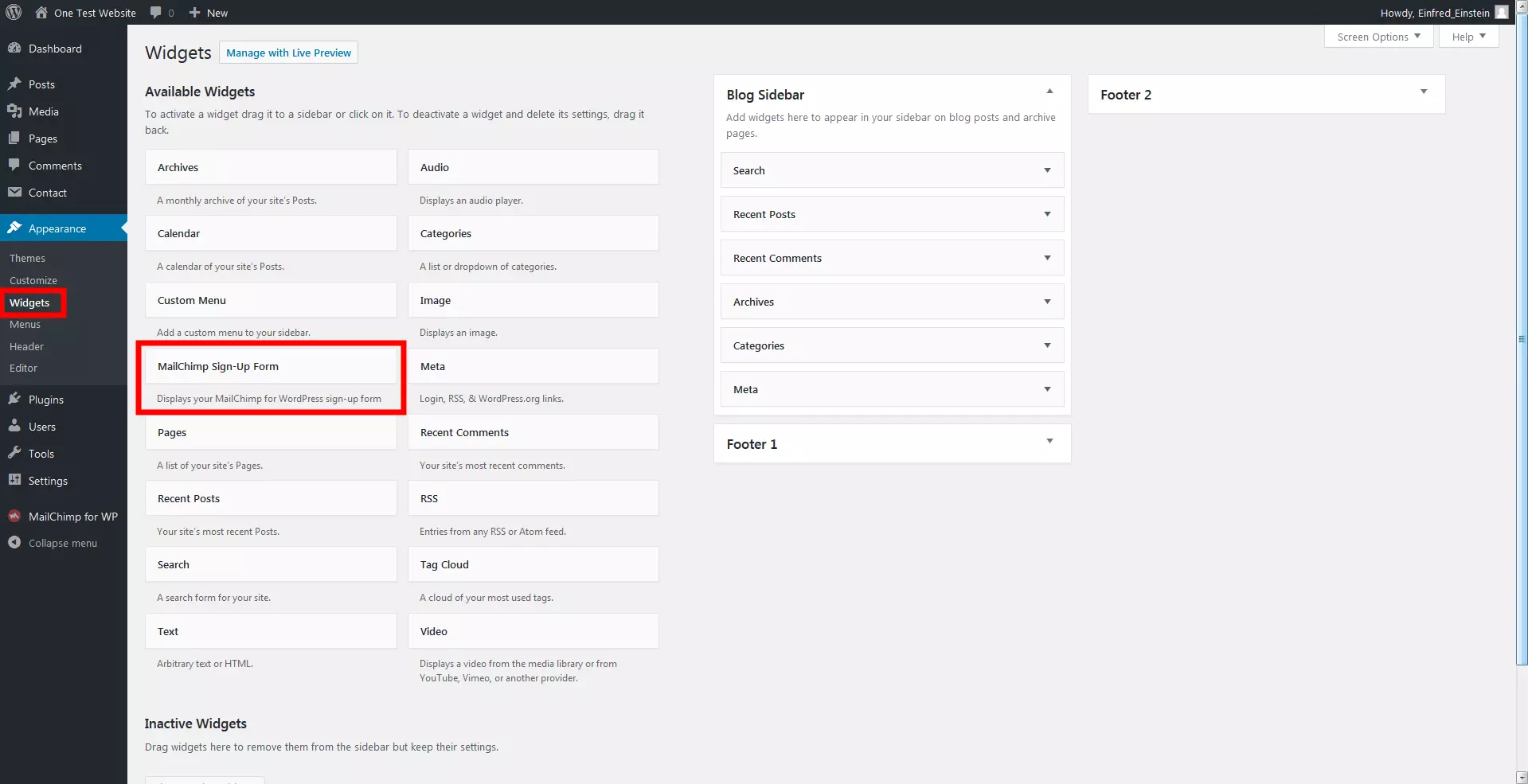 Può anche essere molto efficace inserire il modulo di registrazione sotto forma di widget sul sito web. È possibile integrare la maschera di input nella barra laterale o nel piè di pagina. Il plug-in MailChimp for WordPress ha già fornito un widget con il vostro form: basterà semplicemente che lo trasciniate e che lo rilasciate poi nel punto in cui volete che appaia sul vostro sito web. Assicuratevi però che l'ordine all'interno del back end sia lo stesso dell'ordine sul sito web.