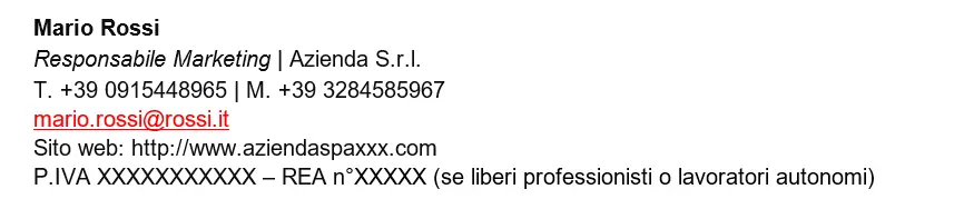 In una firma è prevista anche una divisione in piccoli paragrafi. Come già mostrato nell’esempio precedente, il primo paragrafo può contenere le informazioni personali del mittente, mentre il secondo i dati aziendali; tuttavia non si tratta di regole fisse, per cui l’utente può strutturare le informazioni in modo personalizzato, purché queste siano tutte allineate a sinistra e presentino un’interlinea che permetta una lettura scorrevole.