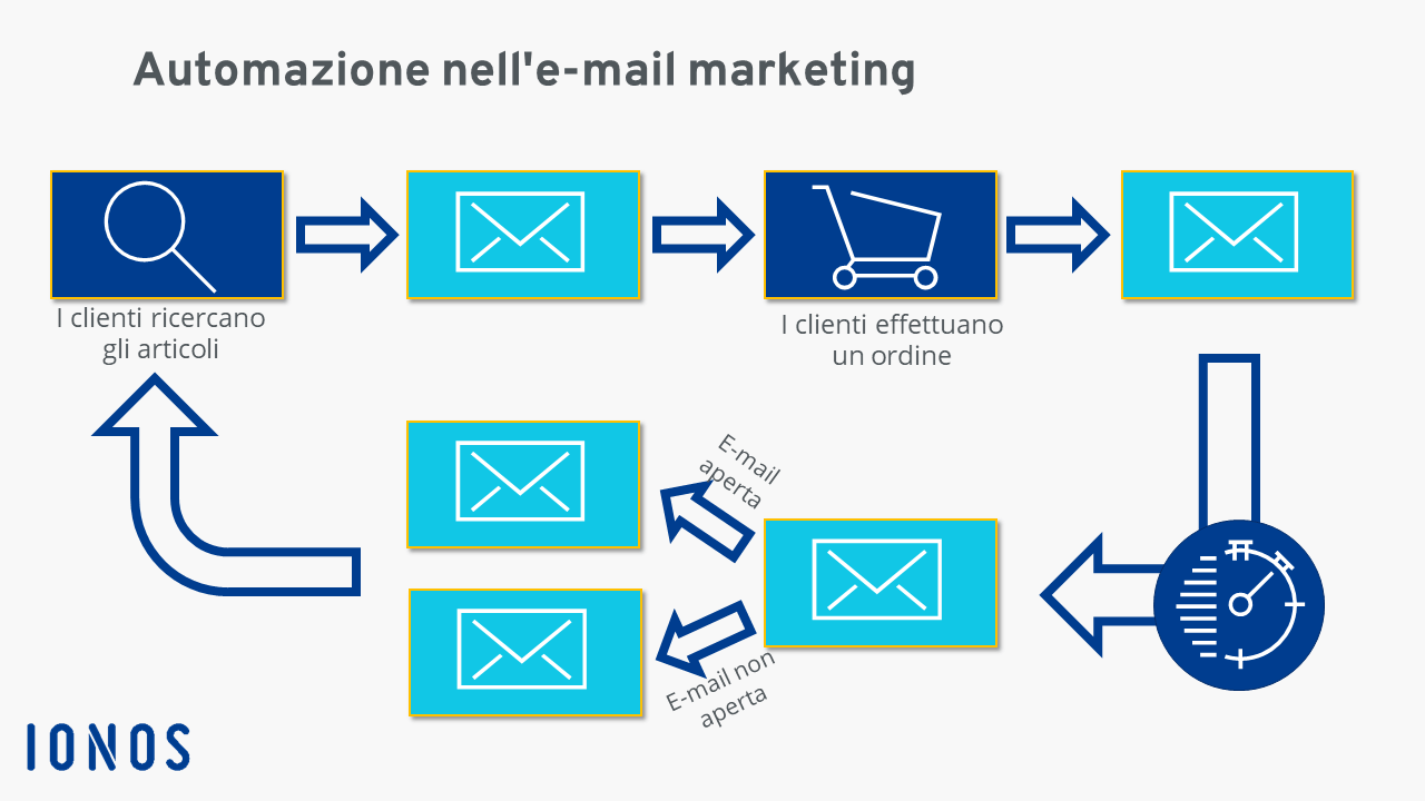 Grazie all’automazione prendi due piccioni con una fava: infatti puoi reagire molto più velocemente e in modo personalizzato per ogni utente. A seconda di come la tua clientela si comporta online, prepara in anticipo la giusta e-mail e la spedisci in tempo reale. Allo stesso tempo risparmi risorse, perché per praticare un e-mail marketing efficace grazie ai processi di automazione hai bisogno di meno tempo e meno personale.