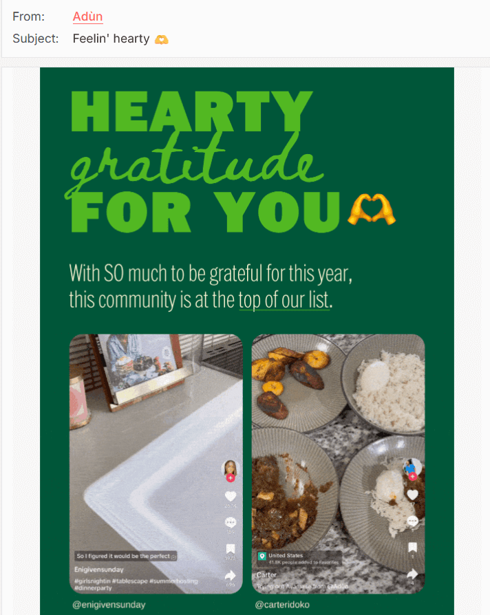 Per quanto tu possa essere abile nel progettare la tua newsletter per convincere i lettori e le lettrici ad acquistare i tuoi prodotti o servizi e fidelizzarli a lungo termine, non riuscirai mai a eguagliare la persuasività e l’affidabilità delle recensioni e delle opinioni di altri utenti. I contenuti generati dall’utente (noti anche come UGC: User Generated Content) possono quindi rivelarsi una vera e propria risorsa di marketing e la loro integrazione rappresenta un’importante tendenza dell’e-mail marketing nel [CURRENT_YEAR]].