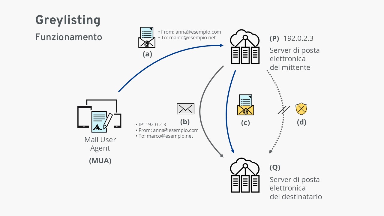 (b) Il server di posta (P) inoltra l’e-mail al server di posta del destinatario (Q). Quest’ultimo verifica la busta dell’e-mail: l’indirizzo IP del server del mittente e gli indirizzi e-mail del mittente e del destinatario. Se la combinazione di questi tre dati non è presente nel server di posta del destinatario (Q), il server rifiuta la ricezione dell’e-mail segnalando un errore tecnico. Il server di posta del destinatario (Q) annota la busta in una tabella; questa e-mail viene “inserita nella greylist”.
