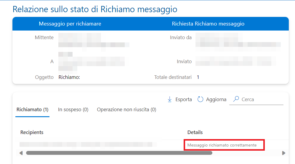 Poi decidi se desideri informare il destinatario del messaggio sull’esito del richiamo.