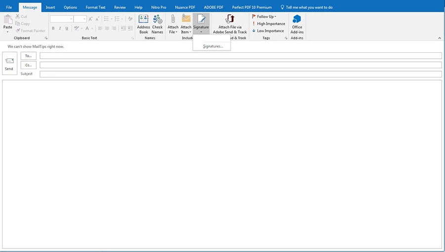- Per aggiungere una firma in modo manuale, fare clic su “Firma” nella scheda “Messaggio” all’interno del testo della e-mail. Si potrà visualizzare un elenco delle firme create precedentemente, qui potrete selezionarne una.