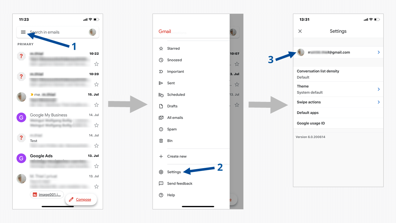 Dopo aver aperto il menu dell’app di Gmail, troverete le impostazioni nella parte inferiore (2). Successivamente verrà visualizzato l’indirizzo e-mail del vostro account (3), che dovrete selezionare. Qui ci sono ulteriori possibilità di impostazione, a partire dalla voce di menu “Account”.