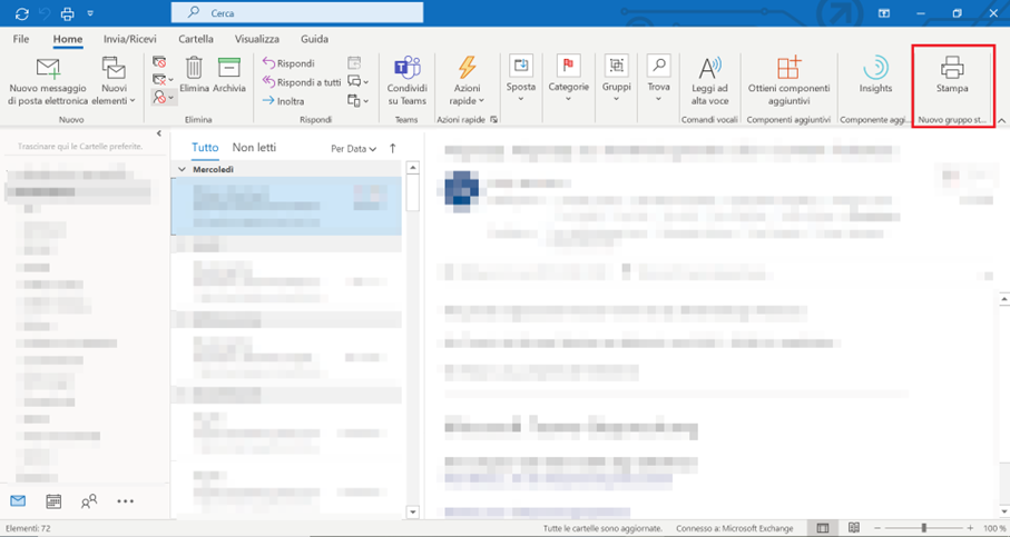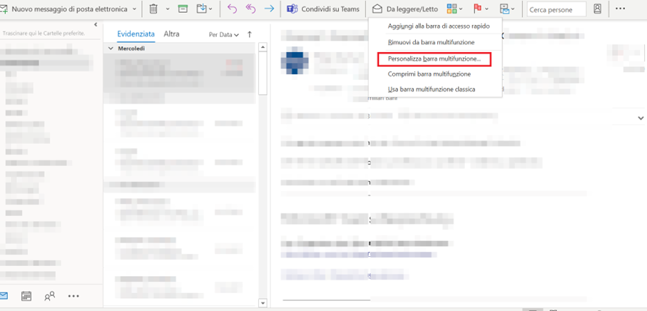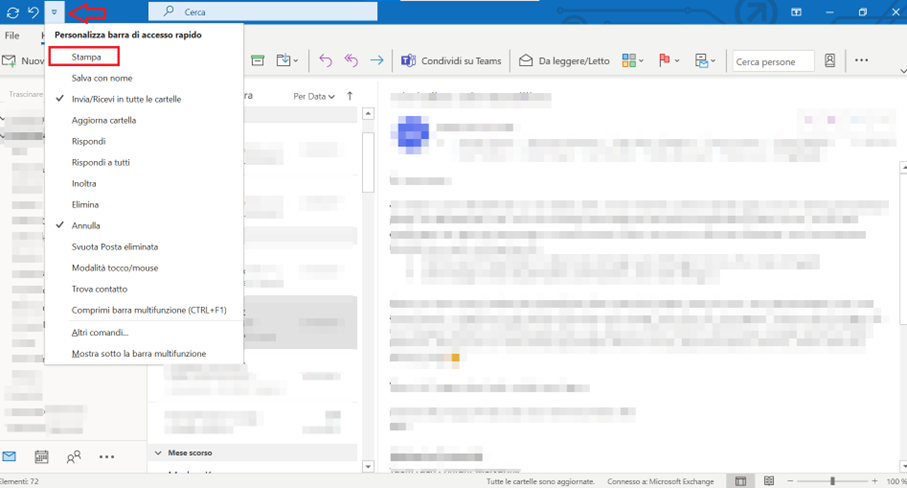Per far apparire il comando “Stampa” anche se apri un’e-mail in una finestra separata, devi ripetere questo processo nella barra multifunzione anche nell’e-mail aperta singolarmente.
