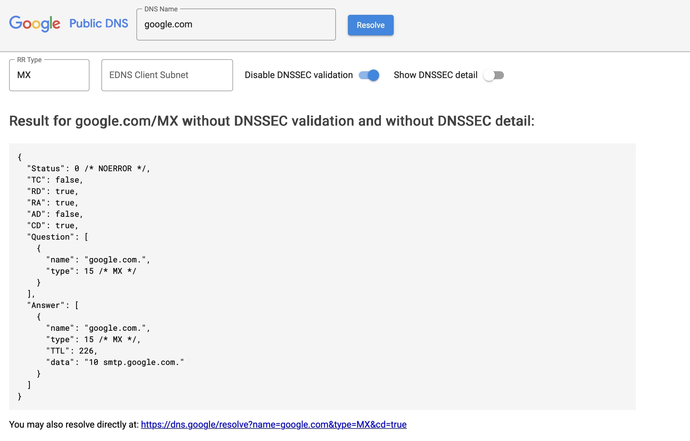 Per eseguire un lookup di record MX è possibile utilizzare diversi servizi web. Molto comodo e facile da usare è il Public DNS di Google. Nella pagina iniziale, inserisci il dominio di cui vorresti controllare i record MX. Nella pagina seguente devi cambiare il tipo di record da A a MX. Le due opzioni EDNS Client Subnet e DNSSEC non devono essere modificate. La prima accelera l’erogazione di informazioni DNS. L’altra invece garantisce che le informazioni non siano state manipolate da terzi.