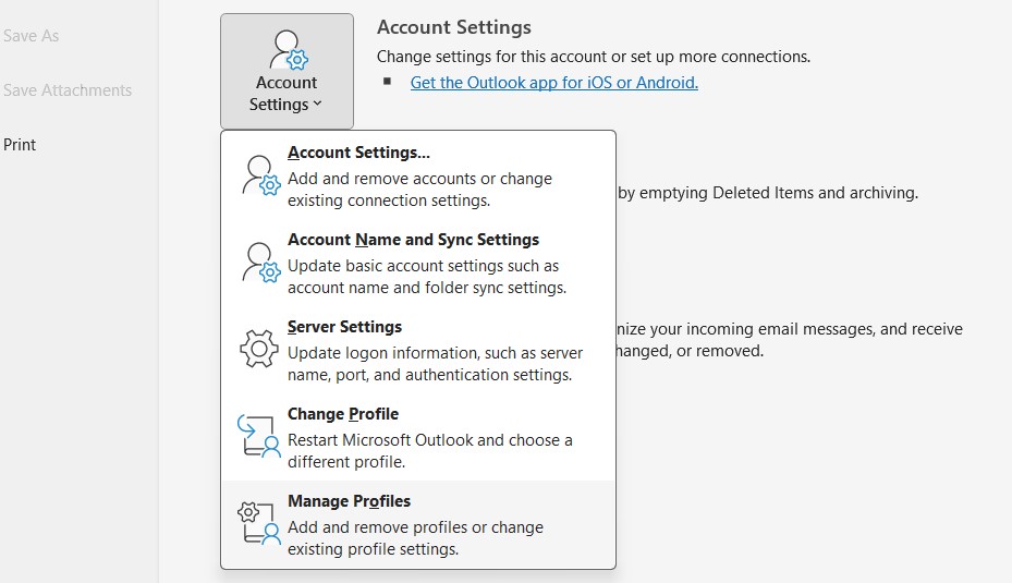 Per configurare o modificare il server SMTP su Outlook, apri prima il client di posta elettronica di Microsoft e poi fai clic sulla scheda “File”. Successivamente, seleziona “Impostazioni account” e “Gestione profili”.