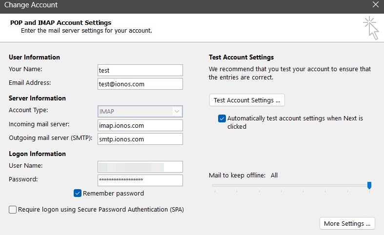 Alla voce “Server di posta in uscita” è possibile inserire il server SMTP di tua scelta, come ad esempio il server SMTP di IONOS smtp.ionos.it.