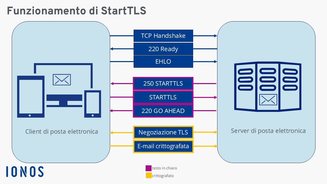 Nel caso del metodo StartTLS, la connessione viene sempre avviata in modalità non cifrata, sulla porta che prevede testo in chiaro. Il protocollo negozia la cifratura con il client soltanto una volta eseguito il comando StartTLS, senza stabilire una nuova connessione. Grazie a StartTLS, in caso di errore nella comunicazione, non è necessario cambiare la porta, dal momento che il client può semplicemente risalire al metodo StartTLS presente sul server di posta elettronica.