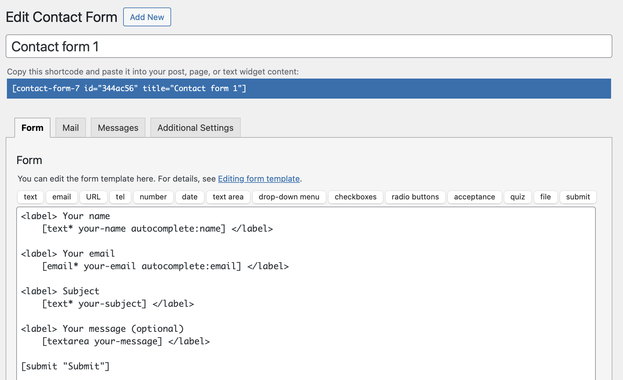 L’interfaccia di Contact Form 7 è mantenuta molto snella e offre ciononostante ampie funzioni.