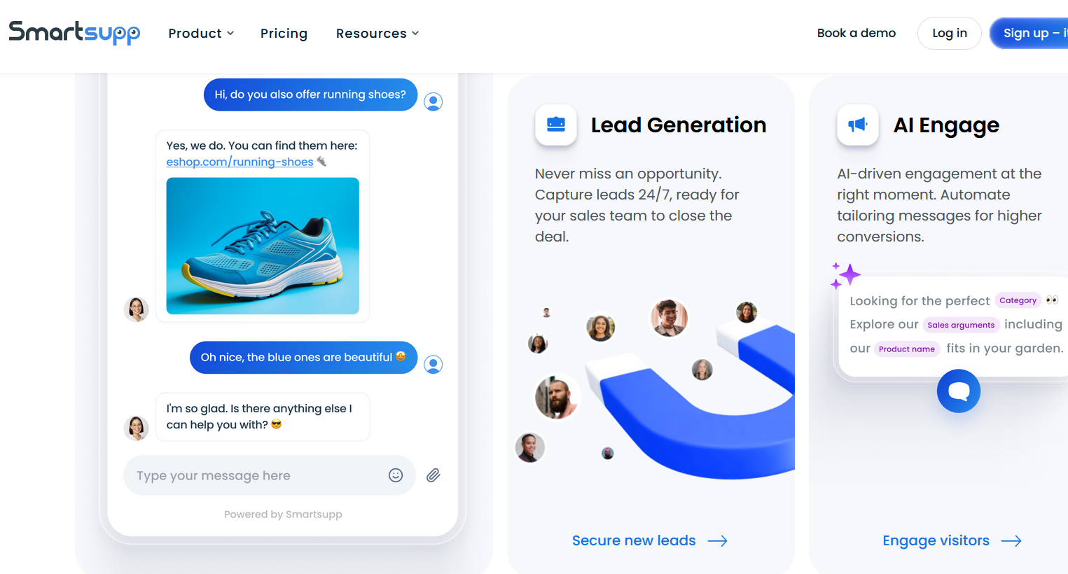 Il plugin per WordPress Smartsupp facilita l’interazione con i visitatori e le visitatrici del tuo sito puntando anche sui vantaggi offerti dall’intelligenza artificiale. Gli assistenti di vendita e consulenza clienti basati sull’intelligenza artificiale ti permettono di automatizzare il tuo supporto online rendendolo disponibile 24/7. Inoltre, è disponibile la funzione AI Engage che, se necessario e dopo aver raccolto dati sufficienti e significativi, mostra automaticamente messaggi personalizzati nel browser dell’utente per proporre prodotti o servizi potenzialmente interessanti. Tutte le informazioni sono archiviate da Smartsupp su server conformi al GDPR dell’UE. Tutte le comunicazioni via chat sono crittografate con AES a 256 bit.