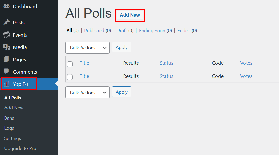 - Nella vostra dashboard fate clic su YOP Poll e poi su “Aggiungi nuovo” per creare un nuovo sondaggio su WordPress.