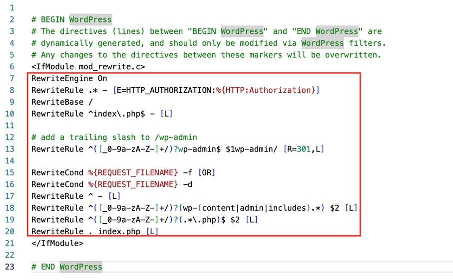 Settimo passaggio: ripeti il sesto passaggio con lo snippet di codice inferiore del back end di WordPress e il file .htaccess. In questo caso si tratta principalmente di sostituire un codice esistente con quello del back end di WordPress. Un file .htaccess esistente con il codice da sostituire può presentarsi così: