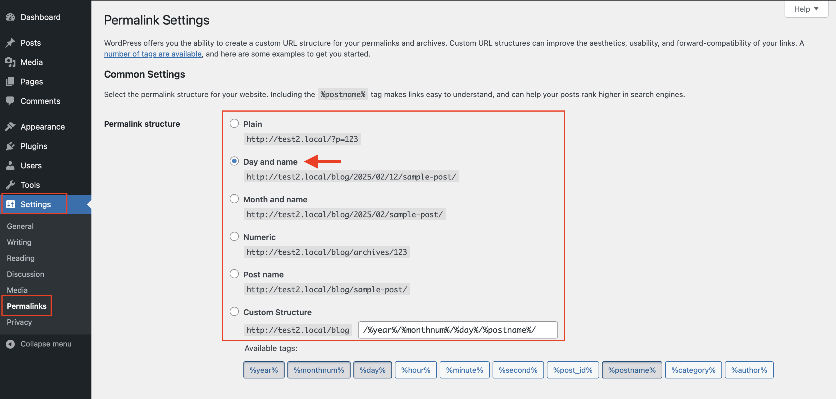 Le impostazioni dei permalink sono disponibili nella sezione “Impostazioni” del back end di WordPress. Mediante le impostazioni dei permalink è possibile determinare l’aspetto degli URL delle singole sottopagine del tuo sito web, ad esempio https://esempiodisito.it/?p=123 oppure https://esempiodisito.it/nome-sottopagina. È importante che la modifica dei permalink funzioni correttamente nel sistema. In caso di dubbi, prova a modificare i permalink. Le modifiche effettuate nelle “Impostazioni comuni” dei permalink dovrebbero essere visibili anche nell’URL visualizzato nel browser. Per visualizzare le modifiche nel browser devi probabilmente ricaricare la pagina.