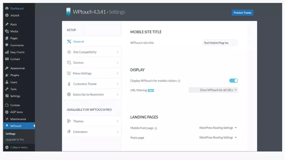 Il plugin WordPress WPtouch consente di aggiungere un tema mobile leggero a un sito esistente. Le operazioni sono chiare e comprensibili nella lingua impostata sulla bacheca di WordPress. Gli elementi e le funzioni disponibili solamente nella versione Pro sono evidenziate cromaticamente.