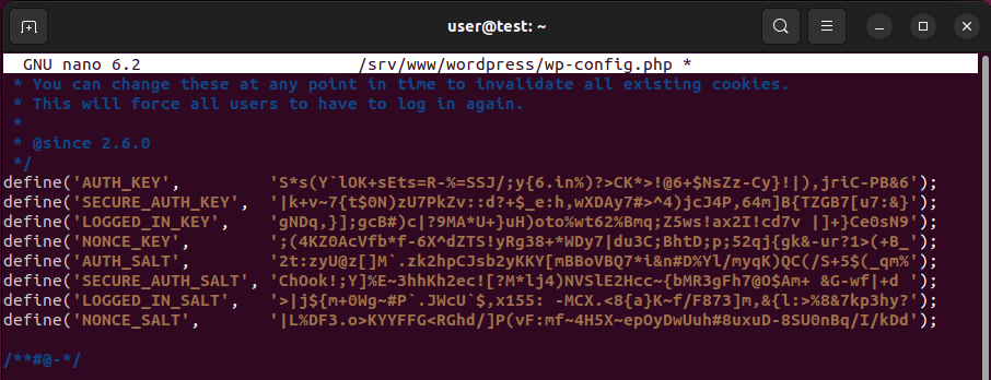 define( 'NONCE_SALT', 'put your unique phrase here' );bashAprite questa pagina di wordpress.org e copiate le voci presentate con le chiavi generate casualmente al posto delle righe precedentemente eliminate. Salvate le modifiche nel file di configurazione.