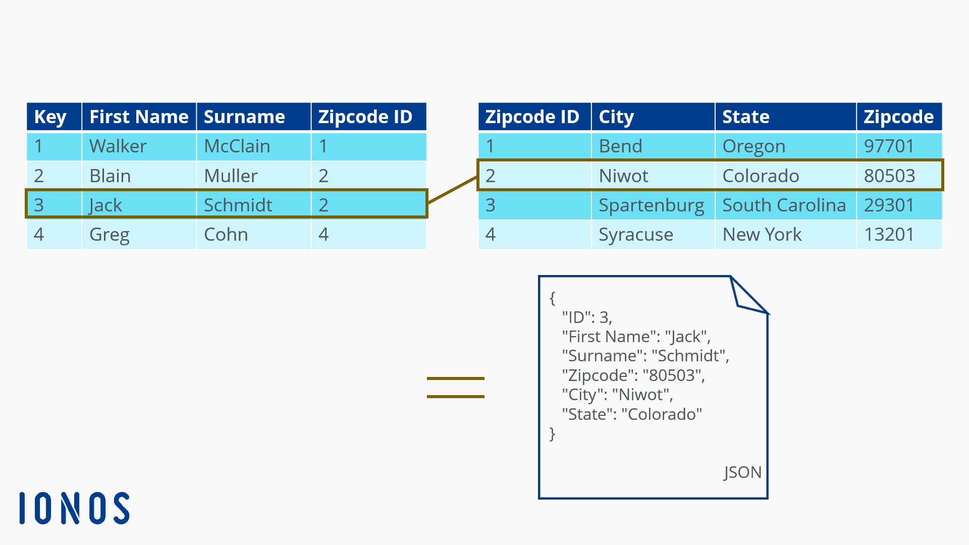 Nel modello relazionale (rappresentato nella figura con le tabelle) vengono stabilite diverse relazioni per leggere un record di dati comune. Nel modello orientato al documento, è sufficiente un singolo documento per memorizzare tutte le informazioni. Lo schema è inoltre liberamente selezionabile: il modello di database orientato al documento è concettualmente schematico, purché il linguaggio del database utilizzato rimanga lo stesso.