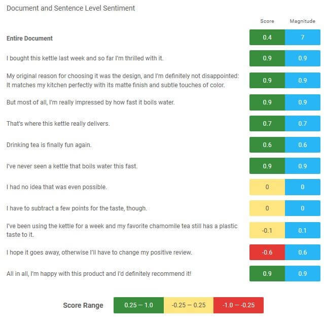 Nel seguente esempio utilizziamo la recensione fittizia di un bollitore. Il risultato mostra dove si trovano i punti deboli di un’analisi automatica del testo. Ad esempio, la frase con la valutazione peggiore contiene l’espressione “non avevo idea”. Tuttavia, leggendo il testo nel suo contesto generale, è chiaro che in quel punto l’utente sta effettivamente lodando il prodotto.