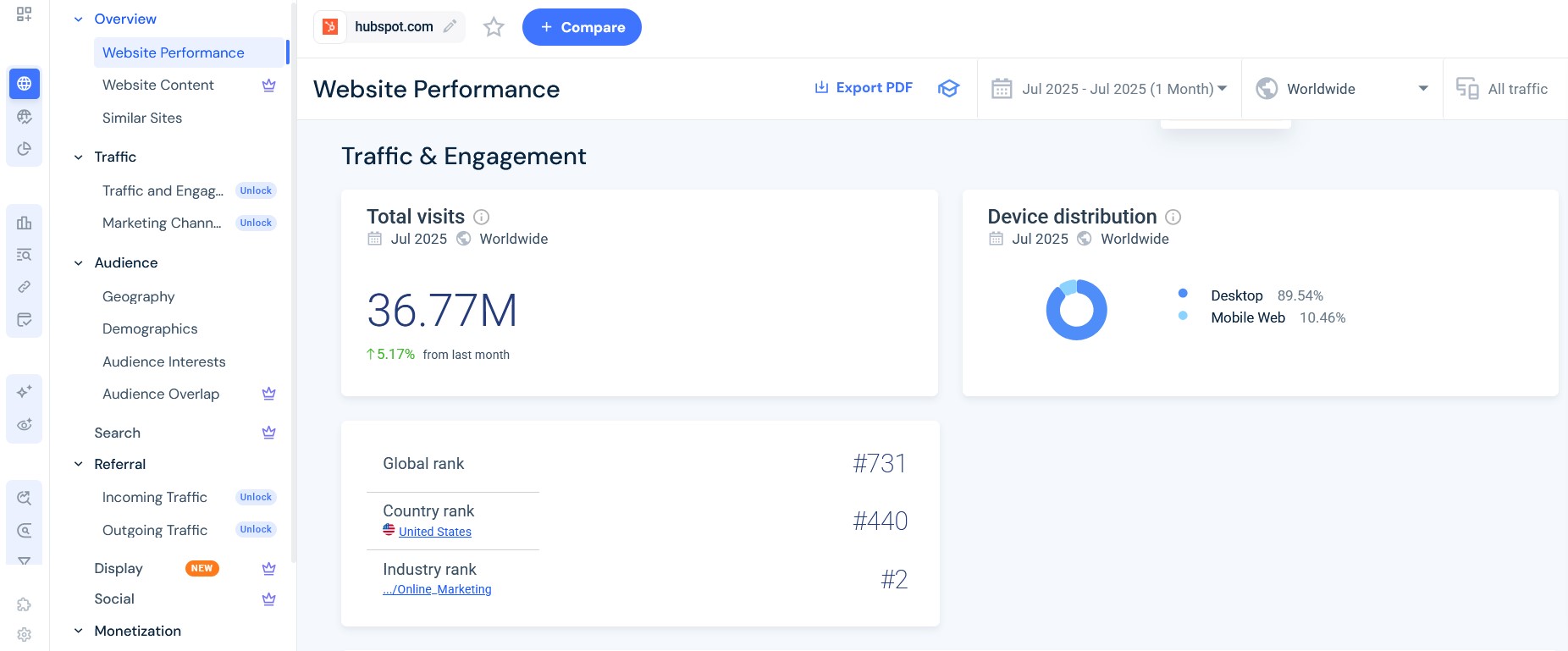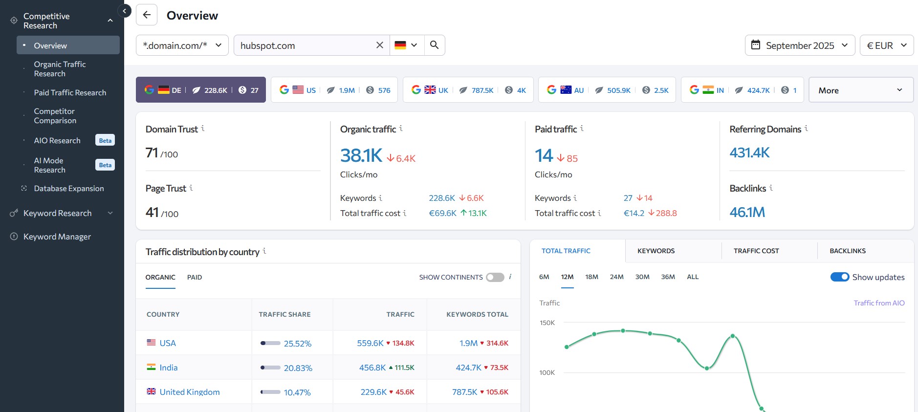 SE Ranking combina stime di traffico con dati su parole chiave e backlink, rendendo visibile come un sito web acquisisca visitatori e visitatrici. Grazie a tendenze e confronti con la concorrenza, lo strumento è adatto per un’analisi di mercato rapida, anche se report dettagliati sono disponibili solo nella versione a pagamento.