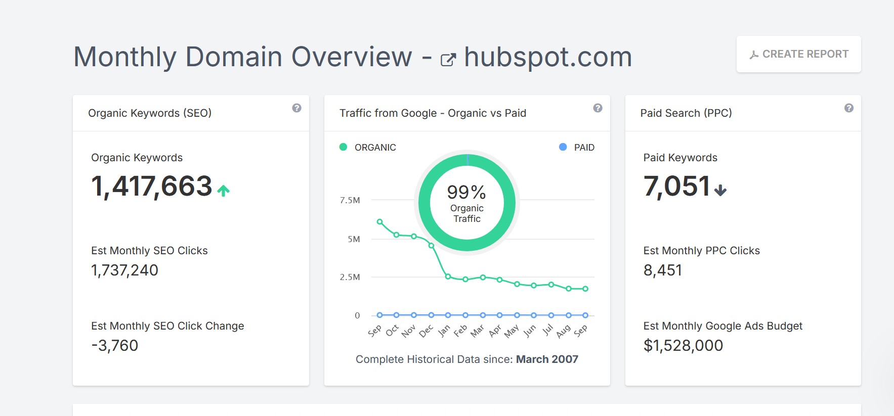 Con SpyFu puoi visualizzare il traffico organico e a pagamento stimato di un sito web inserendo un dominio. Lo strumento mostra anche quali parole chiave portano visitatori e visitatrici su una pagina, quali termini di ricerca vengono usati negli annunci e come i valori si sono evoluti nel tempo. È inclusa anche la possibilità di confrontare più domini, caratteristica che rende SpyFu una soluzione pratica per le analisi della concorrenza.