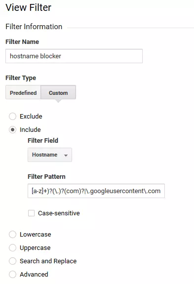 Questo vi servirà più tardi come modello di filtro. Assicuratevi che l’espressione regolare comprenda tutti i nomi host di cui si desidera analizzare il traffico tramite Google Analytics.