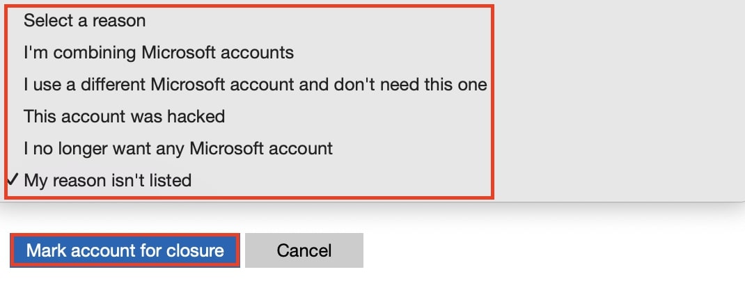 Quinto passaggio: scegli ora un motivo per la chiusura del tuo account. Successivamente, fai clic sul pulsante “Contrassegna l’account per la chiusura”.