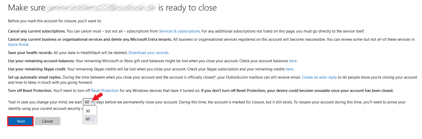Il tuo account Microsoft verrà inizialmente disattivato. Al momento della richiesta di cancellazione, puoi scegliere se eliminare definitivamente l’account dopo 30 o 60 giorni. Questo significa che, quando elimini il tuo account, potrai ancora accedere ai tuoi dati per 30 o 60 giorni e riattivare l’account. Per farlo, accedi semplicemente con le tue credenziali Microsoft. Ti verrà chiesto se desideri riattivare il tuo account.
