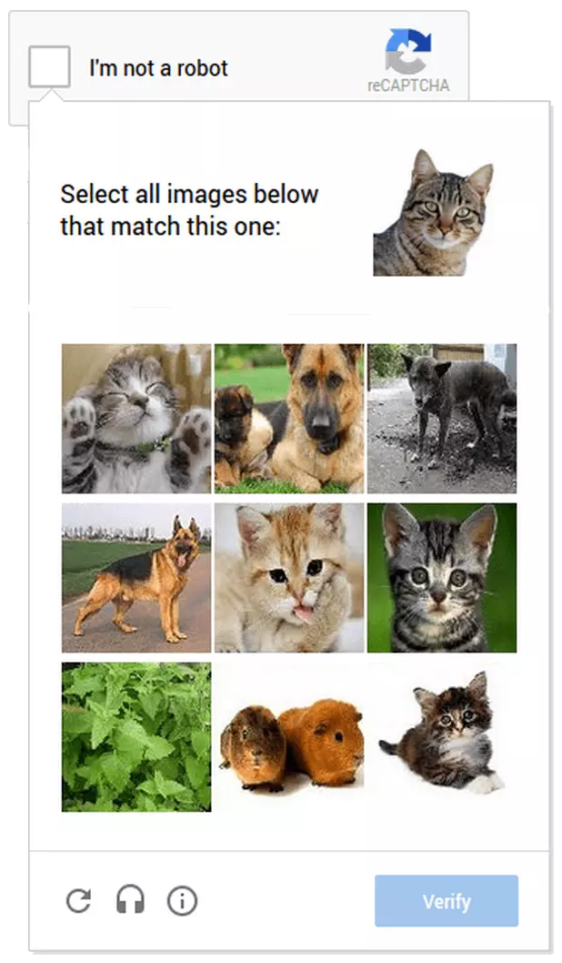 Il seguente esempio mostra un captcha grafico che viene utilizzato nel servizio di Google reCAPTCHA. All’utente viene mostrata un’immagine principale di un gatto e gli viene chiesto di selezionare tutte le altre immagini che raffigurano dei gatti.