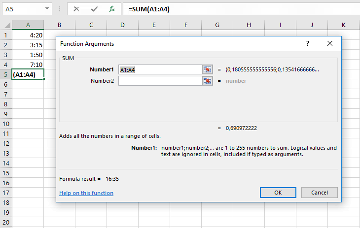 Potete scegliere tra diversi formati di visualizzazione. Avete per esempio la possibilità di impostare una visualizzazione su 24 ore oppure su 12 ore. Scegliete un formato comprendente le ore e i minuti (ed eventualmente i secondi) e confermate l’impostazione. A questo punto potete sommare le celle come di consueto utilizzando la funzione SOMMA. Excel riconoscerà le ore e i minuti correttamente e adatterà il risultato all’impostazione ricevuta. Se immettete la funzione di somma attraverso la procedura guidata (simbolo fx accanto alla barra della formula) potrete vedere, in base ai valori di anteprima, che Excel converte internamente i valori orari.