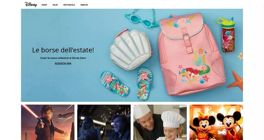 Un attore mondiale come Disney mostra come sia possibile combinare esteticamente offerte mediatiche, pianificazione delle vacanze, shopping, eventi e giochi di vario tipo. Già da un primo sguardo sul sito risulta chiara la struttura del mondo Disney organizzata in maniera chiara e grazie all’utilizzo di immagini emblematiche. Ognuna delle grandi tessere presenti sulla homepage porta l’utente a una pagina d’acquisto.