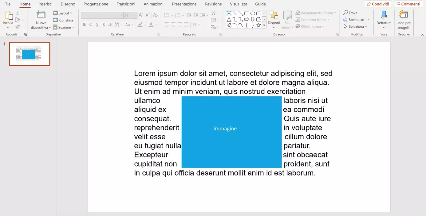 Un approccio alternativo più veloce consiste nella suddivisione del testo in quattro caselle di testo. In questo caso basterà disporre i quattro paragrafi attorno all’immagine. Questa soluzione è vantaggiosa poiché offre una migliore leggibilità e tempi più rapidi di disposizione del testo intorno all’immagine in PowerPoint. Tuttavia, non tutti i testi possono essere suddivisi in quattro parti.