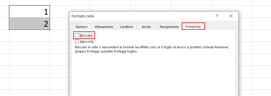 - Nella tab Protezione che si apre rimuovete la selezione dalla casella Bloccata e premete sul pulsante OK.