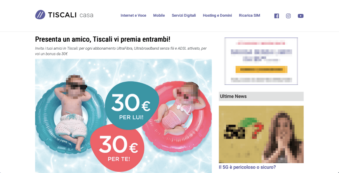 L'azienda di telecomunicazioni italiana Tiscali promette ai propri clienti una ricompensa se portano nuovi clienti. Il premio offerto è destinato sia al nuovo sia al vecchio cliente. L’applicazione e la comunicazione semplice e diretta adottate da Tiscali sono un esempio convincente di referral marketing.