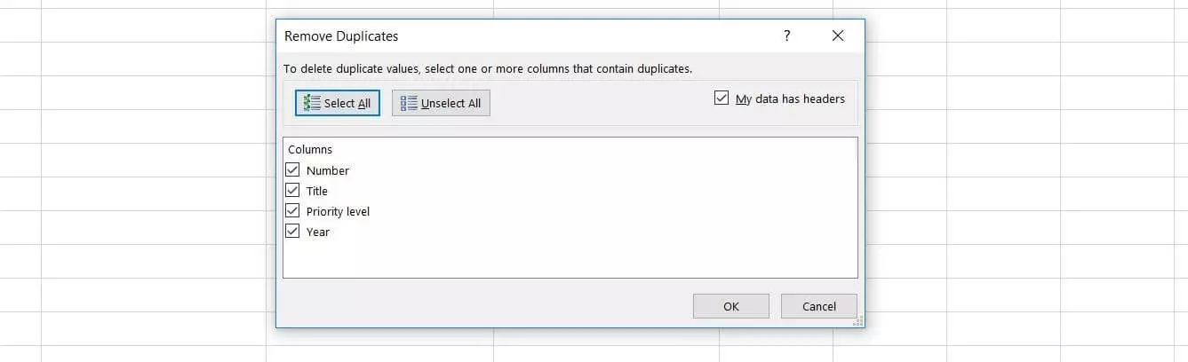 Nella finestra di dialogo "Rimuovi duplicati", deselezionate le caselle di controllo accanto alle colonne della tabella che non devono essere analizzate per la classificazione dei duplicati; nel nostro caso le due colonne "Priorità" e "Anno". Confermate le modifiche con il tasto OK: