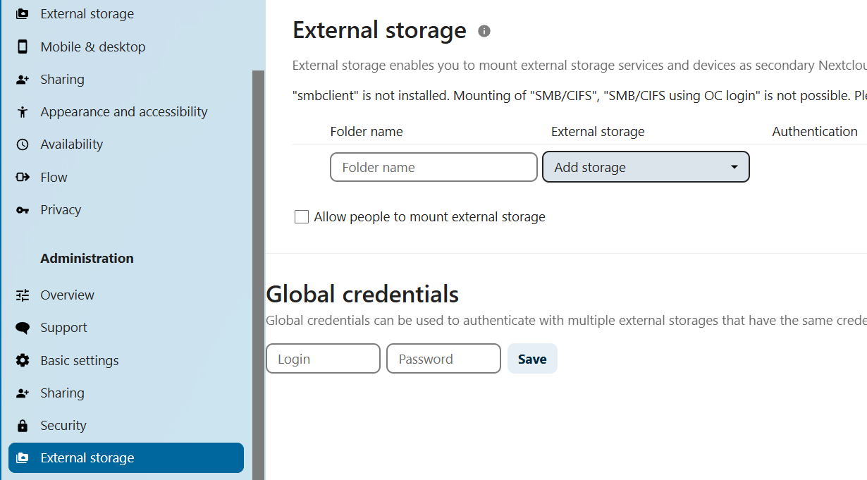 - Nell’area di amministrazione, seleziona prima la voce “External storage”, quindi “Add storage” (aggiungi archivio). Seleziona quindi l’opzione di External Storage desiderata.