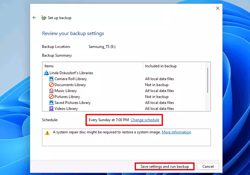 Nell’ultimo passo, confermate le impostazioni facendo clic su “Salva impostazioni ed esegui backup”.