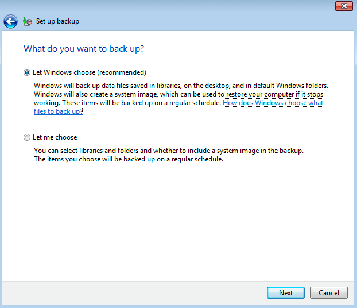 Quando avete scelto il supporto più adatto, Windows vi consente due opzioni: o selezionate voi quali file devono essere inclusi nel backup, oppure lasciate che sia il sistema operativo a effettuare la selezione al posto vostro. La selezione automatica è la più adatta per la maggior parte degli utenti. La selezione manuale è invece consigliata a chi ha più dimestichezza con l’informatica. Quest’ultima consente infatti di selezionare interi dischi fissi o in alternativa solo determinate cartelle.