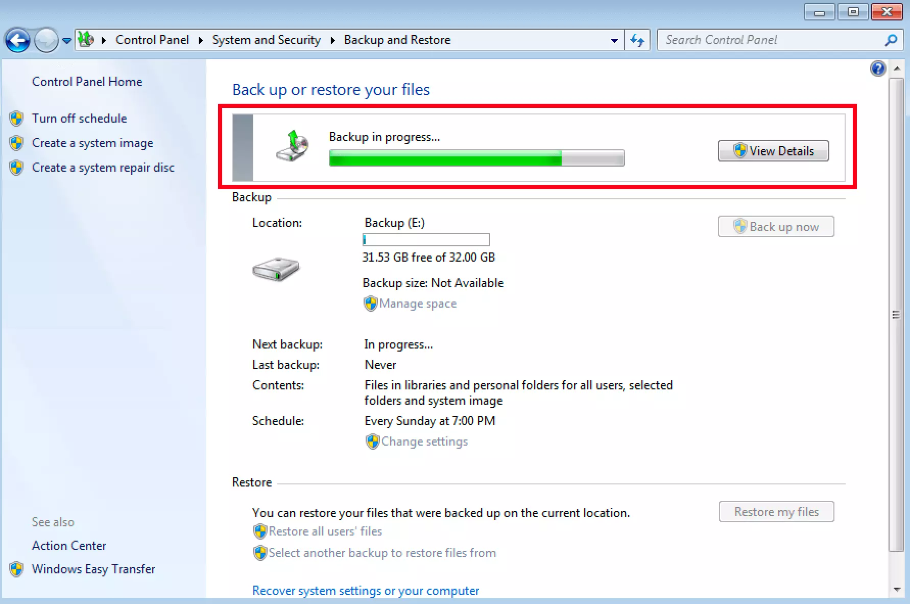 Quando avete terminato la pianificazione, confermate e avviate così il primo backup. Da questo momento comincerà a essere effettuata a intervalli regolari una copia di sicurezza di Windows 7, senza che dobbiate fare niente. Il sistema operativo opera in maniera tale che non siano sempre tutti i file a essere copiati, bensì solo quelli che sono stati modificati dall’ultimo salvataggio.