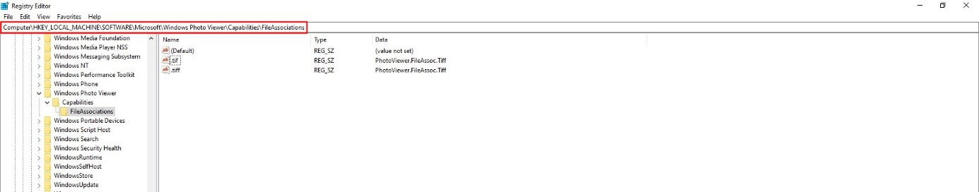 Passaggio 2: inserite i dati dell’amministratore se vi vengono richiesti e confermate l’inserimento con “OK”. L’editor Regedit si apre e vedrete la struttura attuale del registro di sistema della vostra installazione di Windows. Nella fase successiva, navigate al percorso “HKEY_LOCAL_MACHINE” → “SOFTWARE” → “Microsoft” → “Windows Photo Viewer” → “Capabilities” → “FileAssociations”: