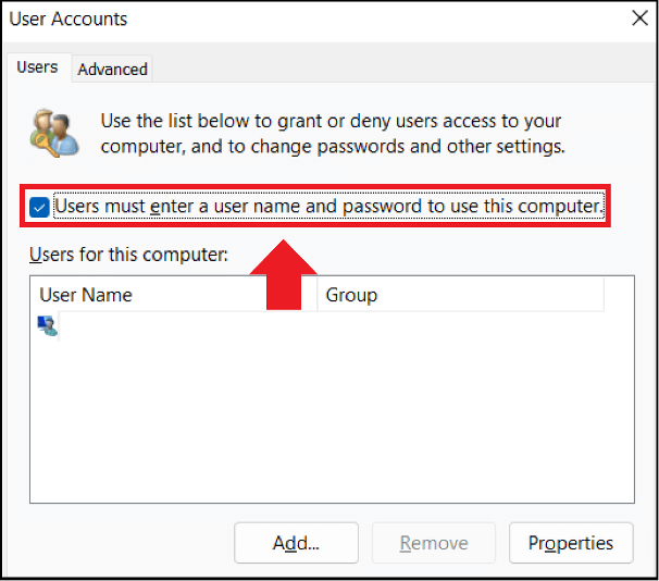 - Togliete il segno di spunta a sinistra, davanti all’opzione “Per utilizzare questo computer è necessario che l’utente immetta il nome e la password”.