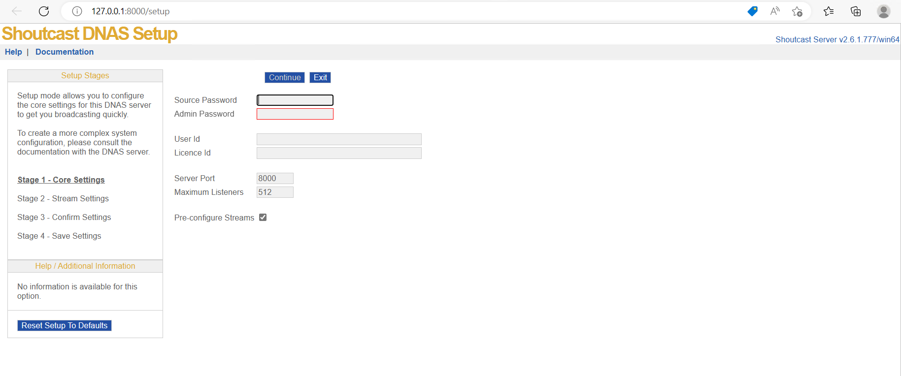 Aprite la cartella Shoutcast e avviate il file setup.bat con un doppio clic. Si aprirà una finestra di input e un’interfaccia di setup nel vostro browser. Qui definirete la configurazione di base del server e del primo streaming.