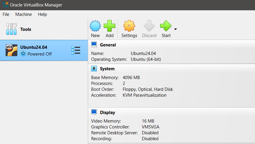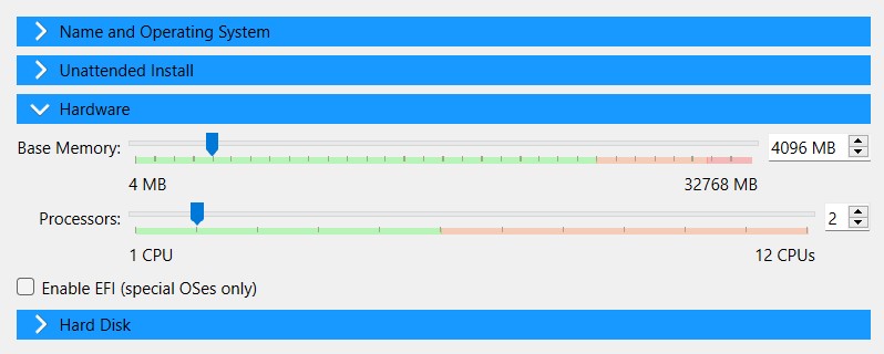Accedi alla categoria successiva chiamata “Hardware”. Qui puoi assegnare alla nuova macchina virtuale una parte della RAM e delle prestazioni del processore fornite dal sistema host. Per Ubuntu 24.04, si consiglia di riservare almeno 4 GB di RAM e 2 CPU.