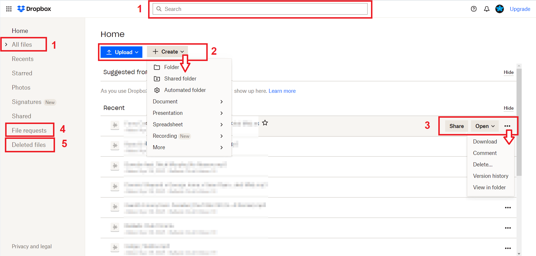 - Esegui l’upgrade: per la gestione del tuo piano di abbonamento a Dropbox.