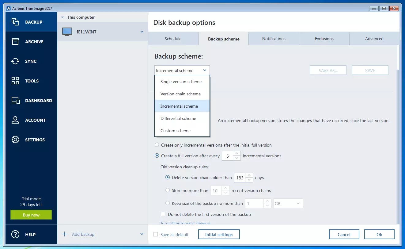 | ✓ Backup e ripristino di interi dischi rigidi o di singoli file | ✗ La versione gratuita mette a disposizione solo degli schemi di backup predefiniti |