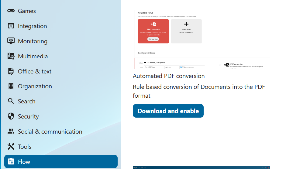 - Creare un nuovo flusso di lavoro: nella scheda “Flow” (Flusso) sono ora visualizzati i processi di lavoro disponibili. Se non hai ancora configurato nessun flusso di lavoro, vedi solo il pulsante “More flows” (Altri flussi). Facendo clic su questo pulsante, Nextcloud ti porta automaticamente allo Store, dove puoi scaricare e installare i flussi disponibili, ad esempio “Automated PDF conversion” (Conversione PDF automatizzata) per convertire automaticamente i documenti in formato PDF.