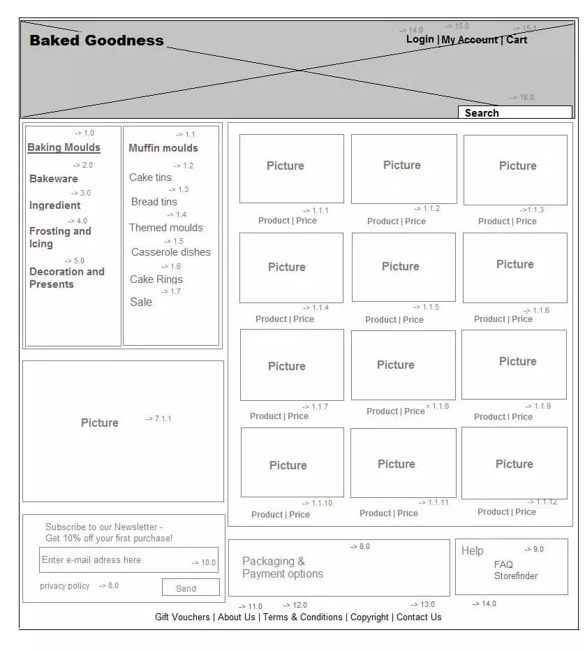 La seguente immagine è un possibile esempio di wireframe statico di un negozio online. Mostra gli elementi di base, le funzioni della pagina e il loro posizionamento. Le categorie principali si trovano nella barra di navigazione e sono collegate visivamente alle sottocategorie e tramite l’assegnazione dei numeri identificativi di pagina.