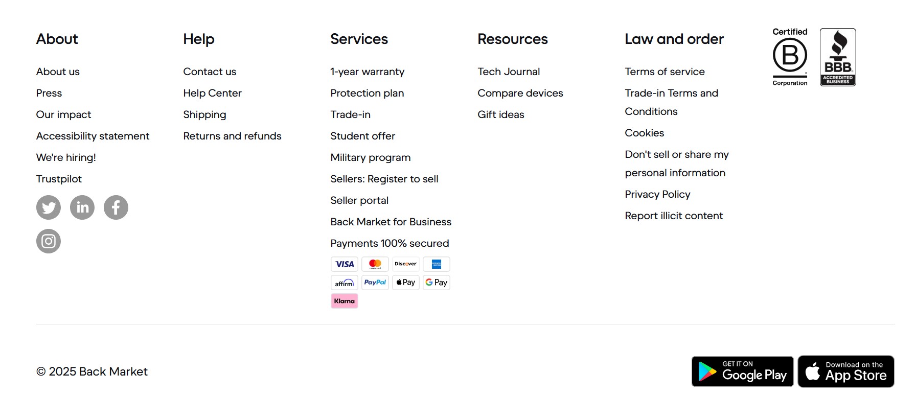 Back Market è una piattaforma online che vende vari tipi di dispositivi elettronici ricondizionati, dagli smartphone agli epilatori. Il footer incorpora alcune caratteristiche extra come un link alla pagina Trustpilot di recensioni sull’azienda e instaura sin da subito un senso di fiducia. Ottiene altri punti anche menzionando la garanzia di 12 mesi. Nella sezione “About” (Chi siamo), a cui si rimanda con un link, viene descritto lo scopo dell’azienda rapidamente e con precisione.