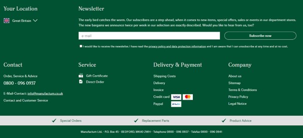 L’azienda di vendita per corrispondenza Manufactum gestisce un grande negozio online e grandi magazzini fisici in 18 sedi. Di conseguenza, il footer del sito web è piuttosto esteso, ma mantiene una struttura chiara e incoraggia i clienti a iscriversi alla newsletter dell’azienda offrendo un buono sconto in cambio. La stretta barra grigia sopra le icone dei social media fornisce inoltre segnali per incoraggiare i visitatori e le visitatrici del sito ad acquistare.